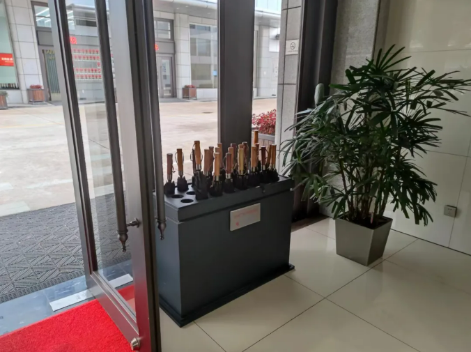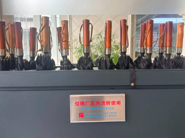 如今,"雙童"的流動(dòng)傘設(shè)施已形成完善的服務(wù)體系。在行政樓、生產(chǎn)車間、餐廳、宿舍等6個(gè)人流量大的區(qū)域,300余把雨傘隨時(shí)待命,確保員工在廠區(qū)任何位置都能就近取用,真正實(shí)現(xiàn)了"雨天無憂",最大化地解決員工雨天出行難的窘境。