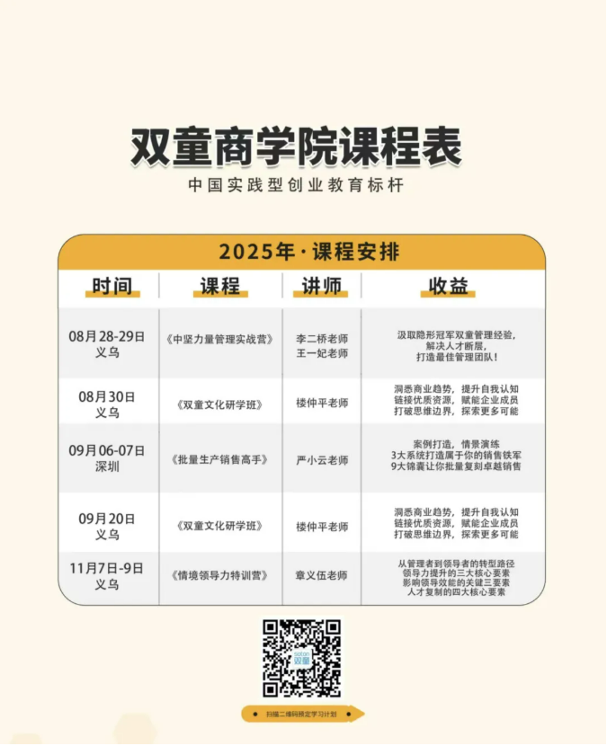 如果你也對“雙童”文化充滿好奇,也想賦能團(tuán)隊(duì)共同成長,歡迎走進(jìn)【雙童文化研學(xué)班】,與上百位優(yōu)秀的創(chuàng)業(yè)者一起學(xué)習(xí)!少量名額,歡迎咨詢鎖定!