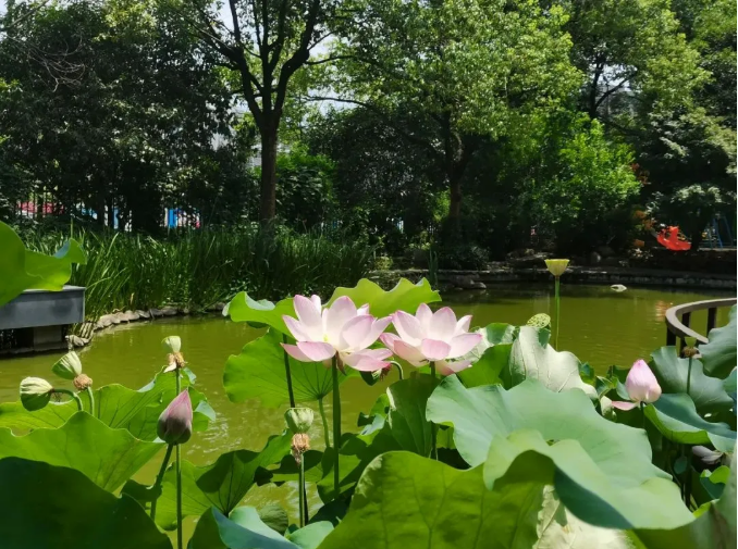 下班時分,總能看到同事們?nèi)齼蓛傻鼐墼诤商吝?。有的靠在欄桿上閑聊,看荷花隨風(fēng)輕輕擺動;有的蹲在岸邊,逗弄水里游來游去的小魚;還有人舉著手機(jī),想把最美的黃昏和荷花一起拍下來。