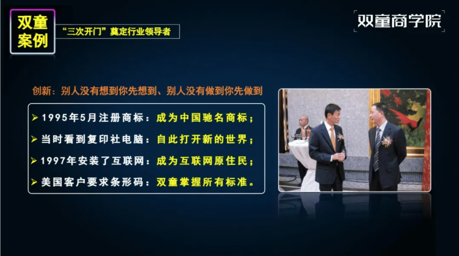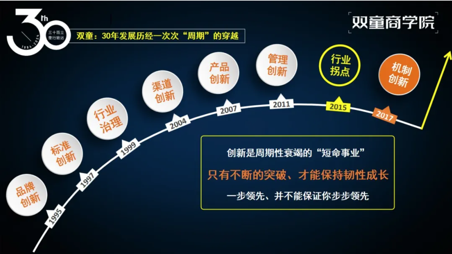 企業(yè)成長(zhǎng)的背后是創(chuàng)業(yè)者的持續(xù)成長(zhǎng),“雙童”能夠一次次成功穿越周期的背后,是創(chuàng)始人樓仲平個(gè)人的持續(xù)成長(zhǎng)、自我進(jìn)化的結(jié)果!也是創(chuàng)始人樓仲平47年如一日踐行"行知合一"的原因。所以在每一場(chǎng)分享中,他都將自己從草根創(chuàng)業(yè)者到行業(yè)領(lǐng)袖的進(jìn)化歷程作為開(kāi)篇,因?yàn)檫@正是“雙童”韌性成長(zhǎng)的核心密碼。