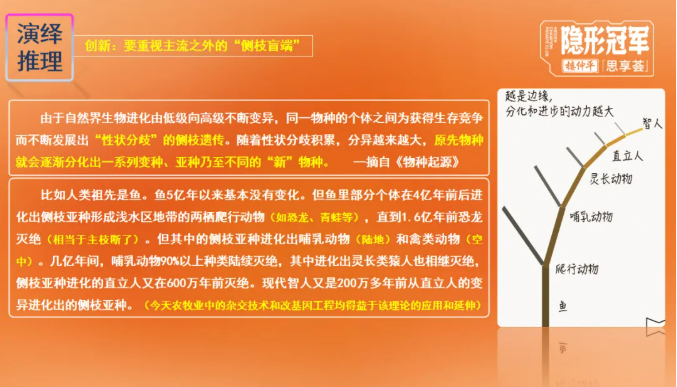 他通過演繹宇宙演化產生“新的分化”,推理出“創(chuàng)新≈分化”的核心命題。以人類進化為例,我們的祖先雖是魚,但并非從魚的“主枝”直接演化而來,而是來自魚的“側枝亞種”——那些游向淺水區(qū)的變異個體,逐漸進化為兩棲動物、哺乳動物,最終誕生智人。這印證了“越是邊緣,分化與進步的動力越強”。