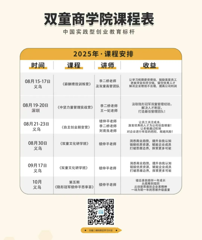 如果你也對(duì)“雙童”充滿好奇,也想賦能團(tuán)隊(duì)共同成長(zhǎng),歡迎走進(jìn)8月30日【雙童文化研學(xué)班】,與上百位優(yōu)秀的創(chuàng)業(yè)者一起學(xué)習(xí)!少量名額,歡迎咨詢鎖定!